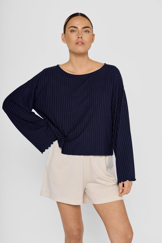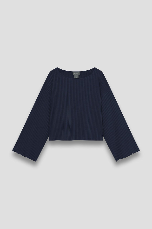 Midnight blue long sleeved top with a slightly cropped fit, wide boat neckline and long lettuce hem sleeves. The lightweight knit-rib has a lustrous stretchy quality that makes the top light and flowy.