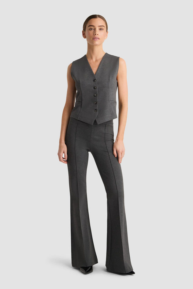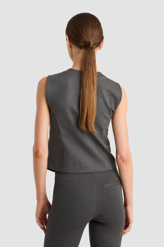 The Courtney Vest in Graphite Melange offers a refined silhouette with its straight fit and slightly cropped length. Expertly tailored, it features two front welt pockets that enhance its sleek design. This vest delivers a feminine and sophisticated look, making it a versatile addition to any wardrobe seeking understated elegance.