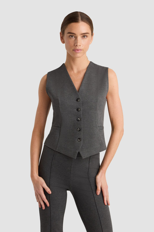 The Courtney Vest in Graphite Melange offers a refined silhouette with its straight fit and slightly cropped length. Expertly tailored, it features two front welt pockets that enhance its sleek design. This vest delivers a feminine and sophisticated look, making it a versatile addition to any wardrobe seeking understated elegance.