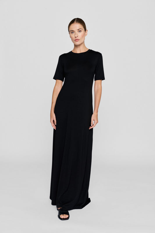 Black lightweight maxi dress in a silky and stretchy TENCEL™ lyocell blend. The form-fitting bodice flows into a streamlined full skirt. The silky material drapes over the body for refined elegance and ease.