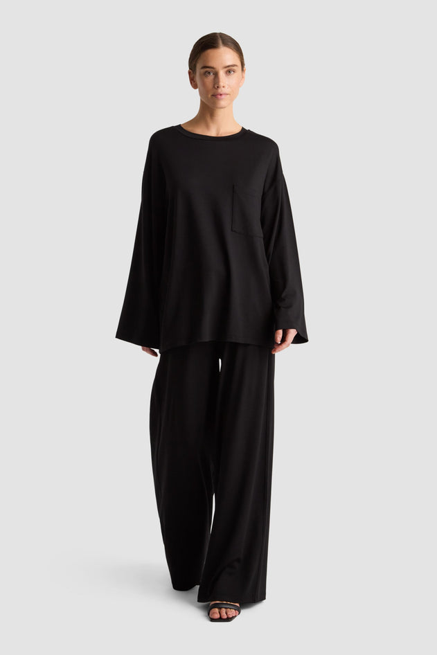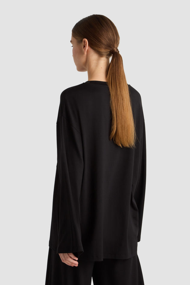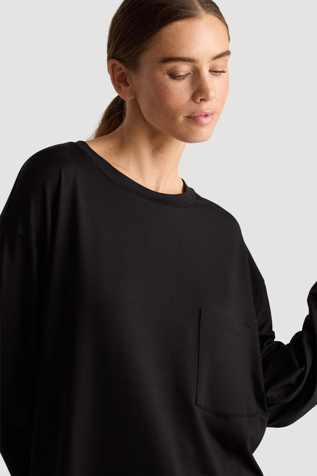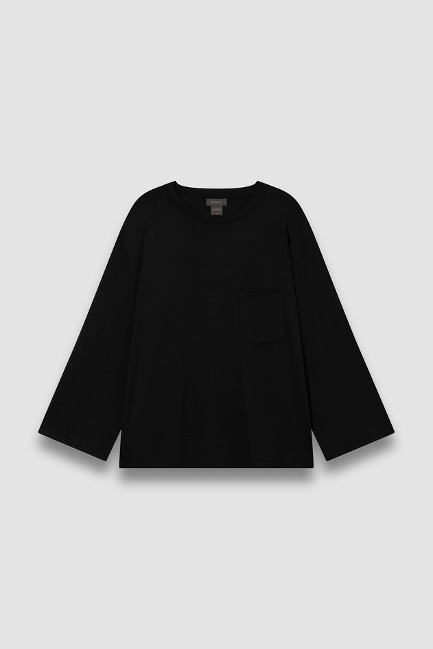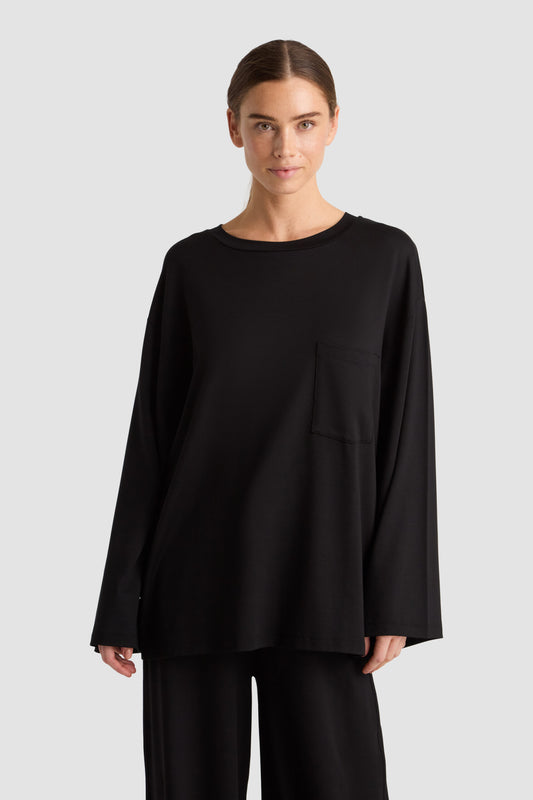The Goma Top in black offers a relaxed, straight silhouette designed for comfort and ease. Featuring a rounded neckline and long sleeves, it provides a versatile layering option. The chest pocket adds subtle detail, combining practicality with minimalist style, making it an essential piece for a refined, casual wardrobe.