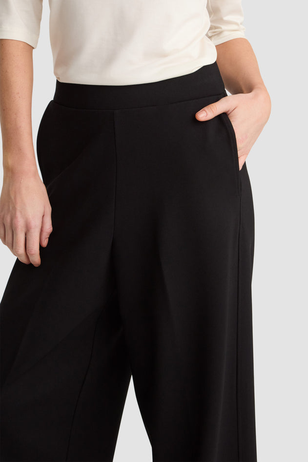 Luna Pants in black offer a refined silhouette with their exceptionally wide fit, creating a balance between feminine grace and strength. Tailored with pressed front pleats and practical slanted side pockets, these flowing trousers combine elegance with everyday functionality, making them a sophisticated choice for confident styling.