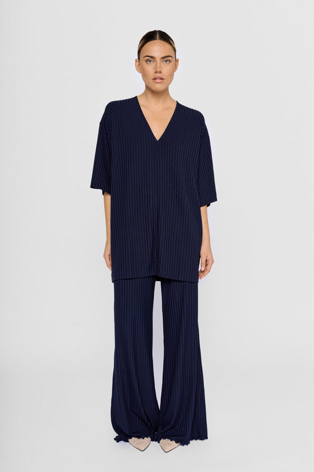 Oli Top has a loose and relaxed fit, a V-neck and wide, elbow length sleeves. The lightweight knit-rib has a lustrous stretchy quality that makes the shirt light and flowy.