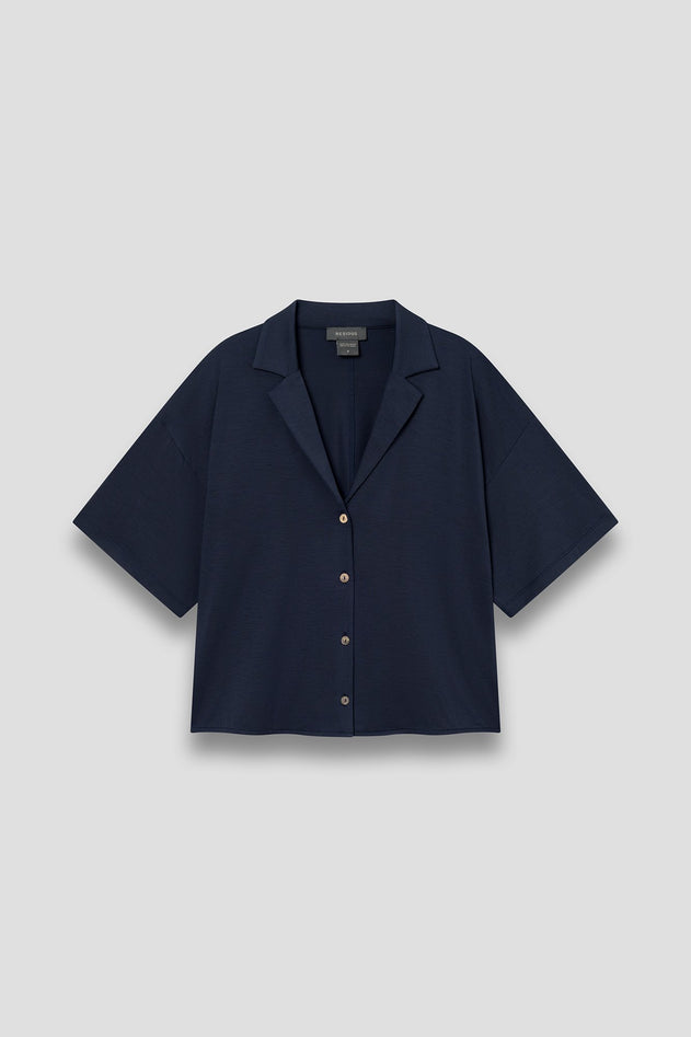 Lightweight jersey blouse with relaxed, boxy silhouette. Shiba has a slightly cropped fit, button closure, short sleeves, and a soft notched collar forming a V-neckline. The material is silky and stretchy, and the coconut buttons are crafted from food industry waste.