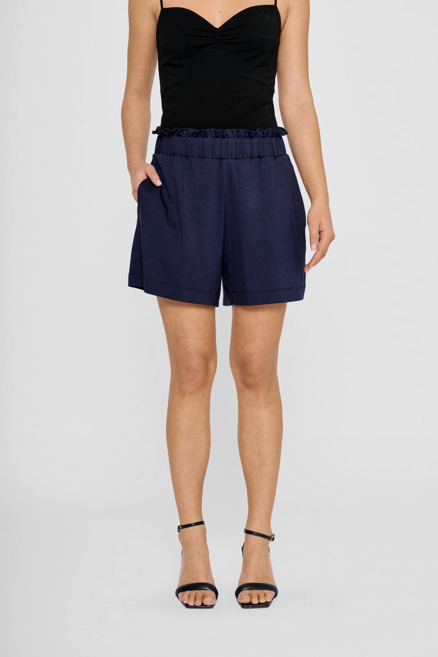 These dark blue A-line mini shorts have a relaxed fit, a soft drape, and a subtle ruffled edge at the waistband. The silky and stretchy TENCEL™ lyocell blend is perfect for keeping comfortable but still looking chic on hot summer days.