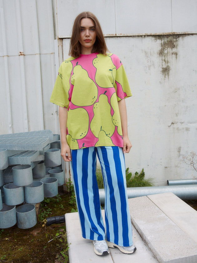 Fun and soft blue striped sweatpants with a straight leg and an elastic waistband. The double size corresponds to the larger size.
