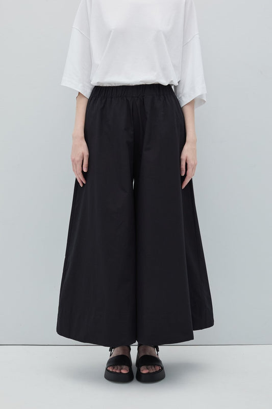 Skirt-effect pants with elastic waist made with 100% organic cotton. Very flared legs and inserted side pockets.