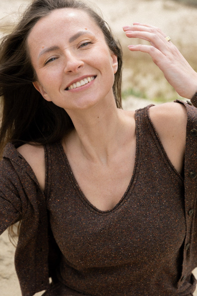 The Sabbia tank top is knitted from a luxurious blend of organic cotton, silk, merino wool and viscose, creating a unique sandy texture. The minimalist design makes it easy to style and layer with other pieces in your wardrobe.