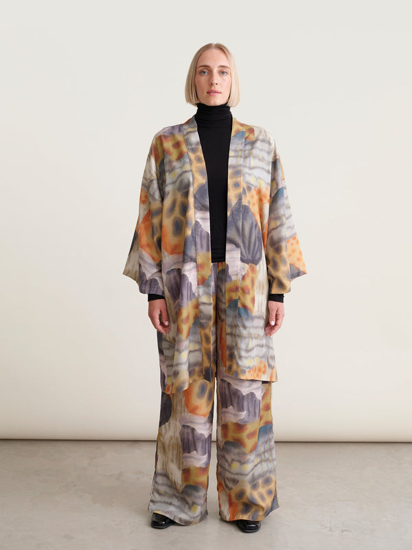 This Saltwater Kimono Jacket is crafted from luxurious woven TENCEL™ Lyocell, offering a soft and sustainable fabric choice. Featuring an elegant saltwater-inspired all-over print and long, wide sleeves, it combines comfort with a distinctive style.