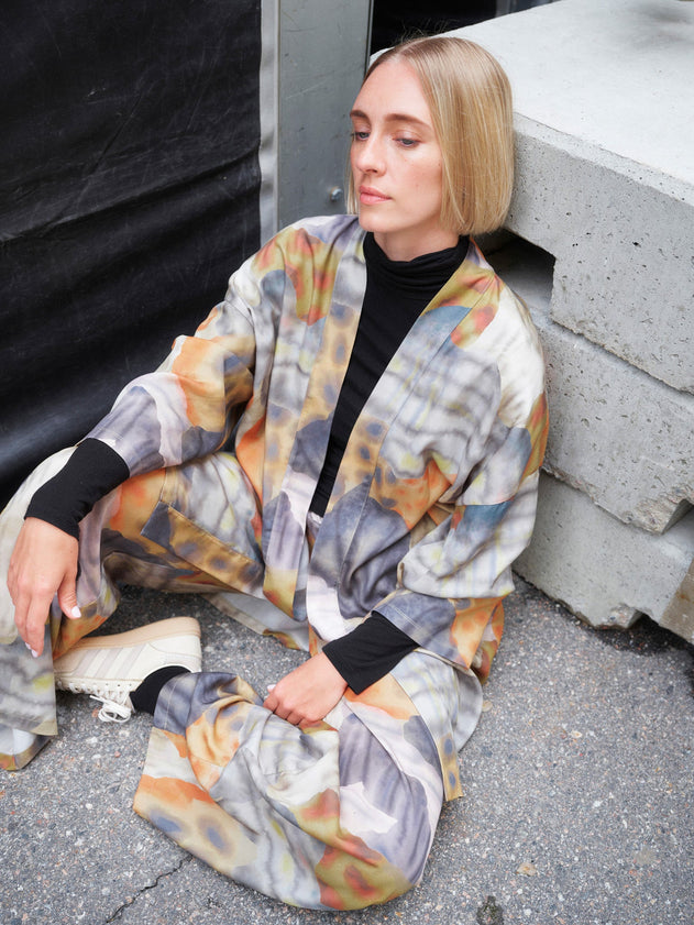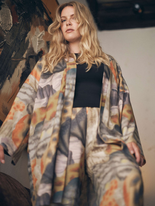 This Saltwater Kimono Jacket is crafted from luxurious woven TENCEL™ Lyocell, offering a soft and sustainable fabric choice. Featuring an elegant saltwater-inspired all-over print and long, wide sleeves, it combines comfort with a distinctive style.