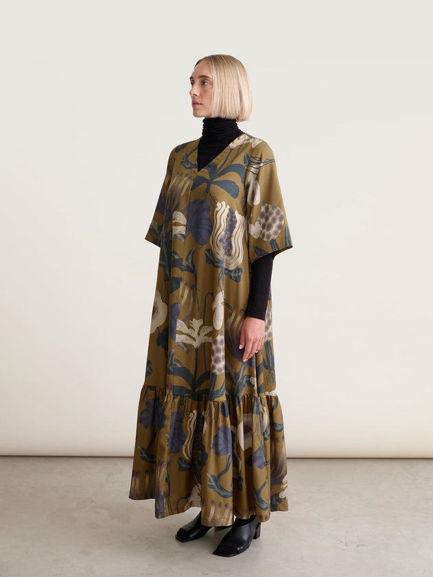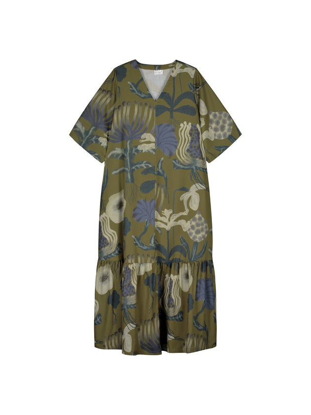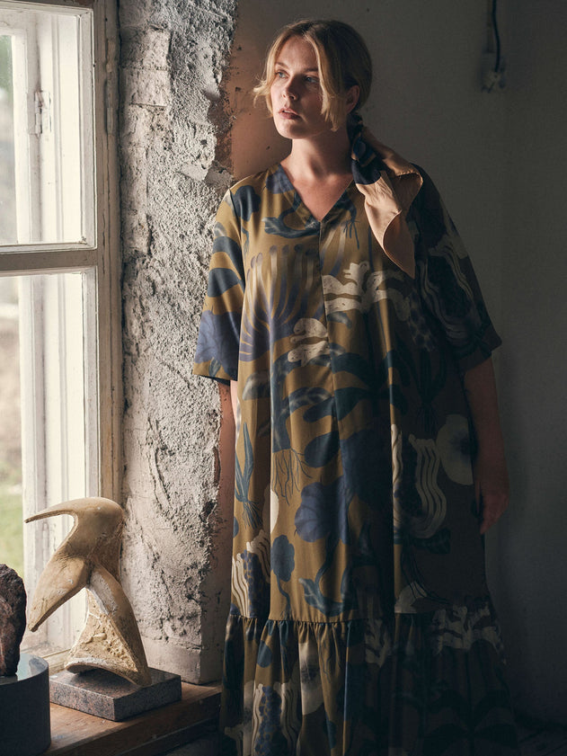 This Sea Flowers Maxi Dress is crafted from breathable woven TENCEL™ Lyocell fabric, offering a soft, sustainable feel. Its elegant all-over Sea Flowers print complements the flattering V-neck and ¾ sleeves, while the wide hem enhances movement. Practical side seam pockets add convenience without compromising style, making it a refined choice for warm-weather occasions.