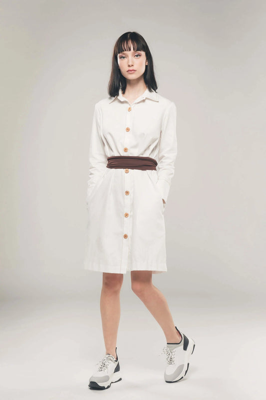 With the ability to be worn as a shirt, dress, or jacket, the structured shirt dress is a sustainable fashion staple for any capsule wardrobe . It ensures comfort and movement as a priority along with style, and a tie-waist comfortably flatters the body in the sustainable clothing. Made with GOTS certified 100% Organic Cotton