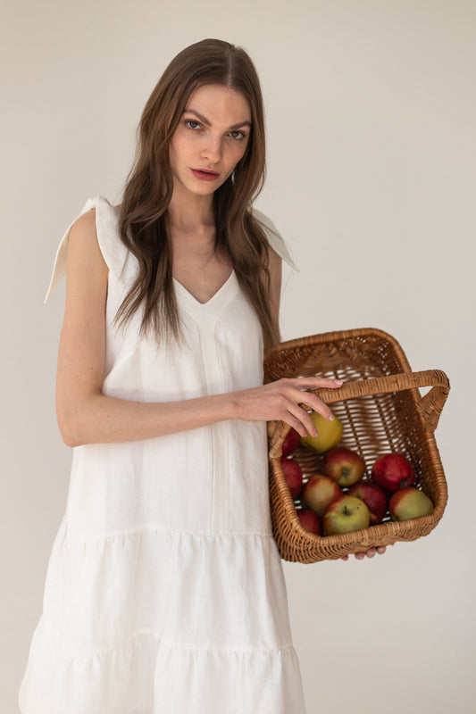 This ecru linen dress tied at the shoulders is perfect for summer. The dress has a loose, oversized fit. The V-neckline is nicely accentuated with thick fabric trim. The dress is finished at the bottom with a double ruffle, very delicately gathered. The straps are adjustable. The dress is extremely comfortable and airy, made of 100% Polish linen with a viscose lining. The dress is also available in blue.