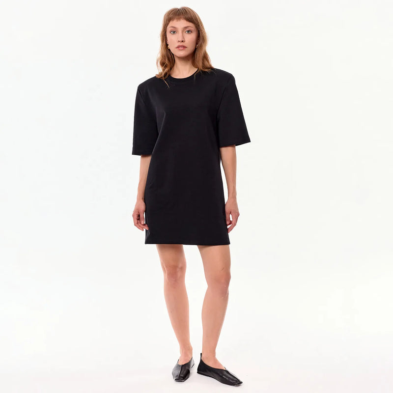 Raya dress is a combination of classic and modern. The simple cut gives freedom and oversize comfort. Made of high-quality cotton with elastane, the short length and wide 3/4 sleeves give it lightness, while the round neckline and detachable shoulder pads emphasize its original character. You can freely style the dress with sneakers or elegant accessories.