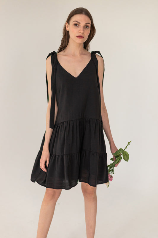 The black Summer dress tied at the shoulders is perfect for summer. The dress has a loose oversized fit and pockets in the seams. It has a V-neckline and is finished with a double ruffle at the bottom, which is very delicately gathered. The straps are long and adjustable, and can be tied in various ways, in bows or left loose. The dress is extremely comfortable and breathable, made of viscose with a viscose lining. The dress is also available in red, black, and beige.
