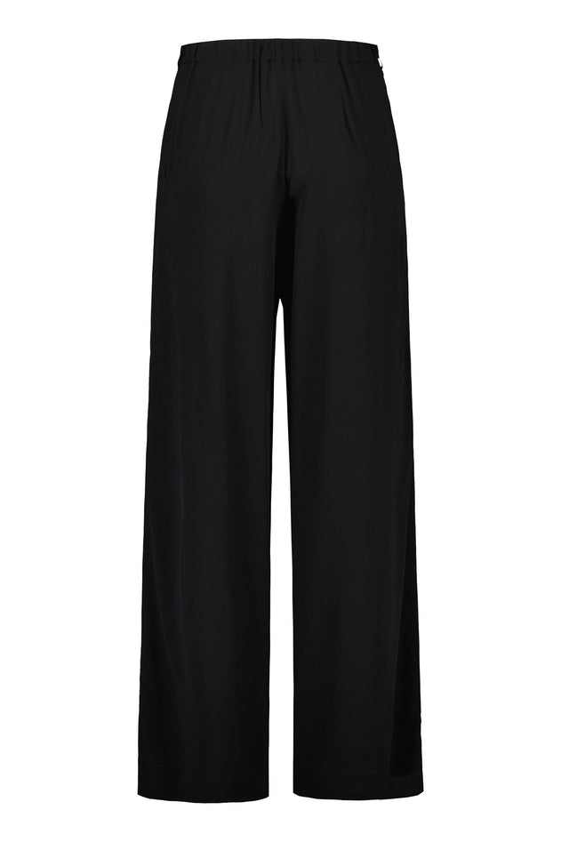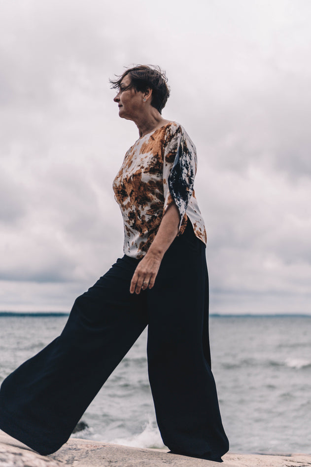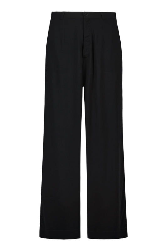 The Svartholm pants are made from 100% EcoVero, featuring a beautifully draping wide-leg design. EcoVero is breathable and structured, providing a well-defined look. The full-length, straight wide leg moves gracefully as you walk. The pants have belt loops at the waist, back darts, and an elastic band for extra comfort. They also feature a zipper and button closure.