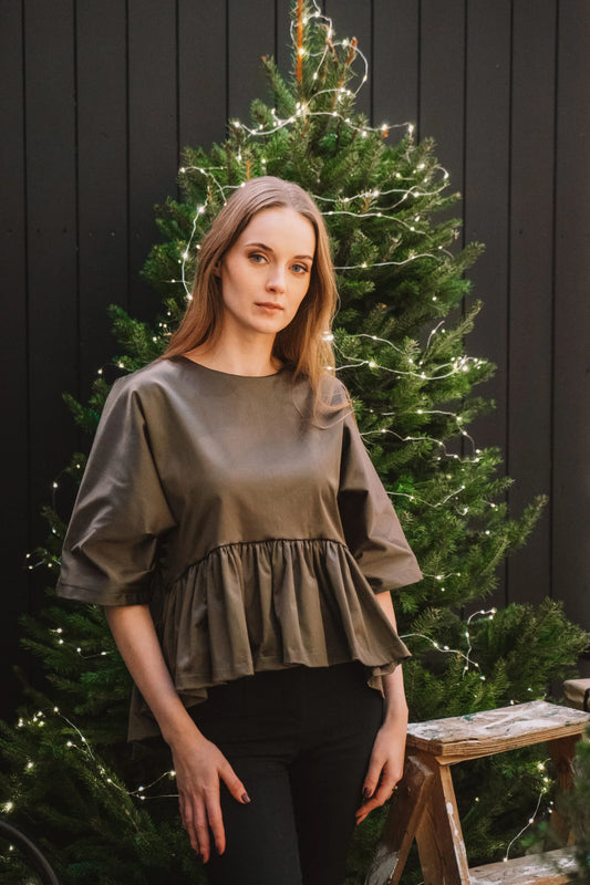Liisa is a loose, ruffle-detailed T-shirt made from cotton satin with a subtle sheen.