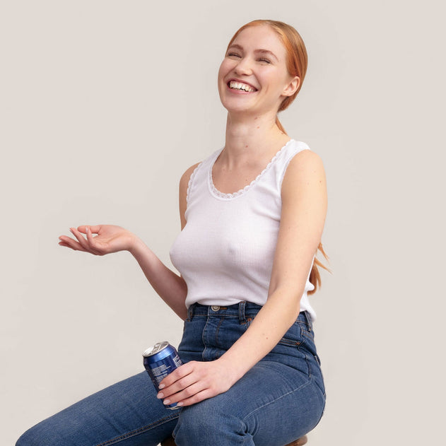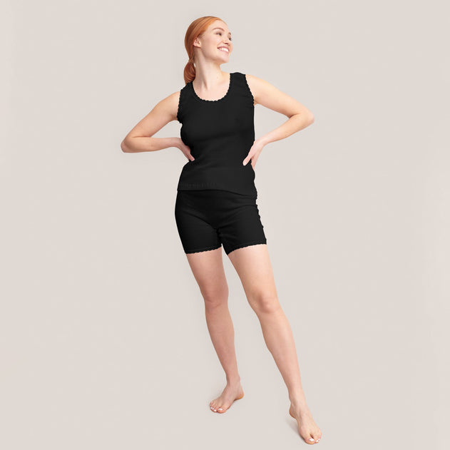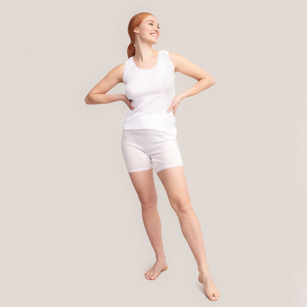 The sleeveless shirt is a thin, stretchy top made from cotton jersey fabric. It features a beautiful narrow lace trim at the neckline and armholes.
