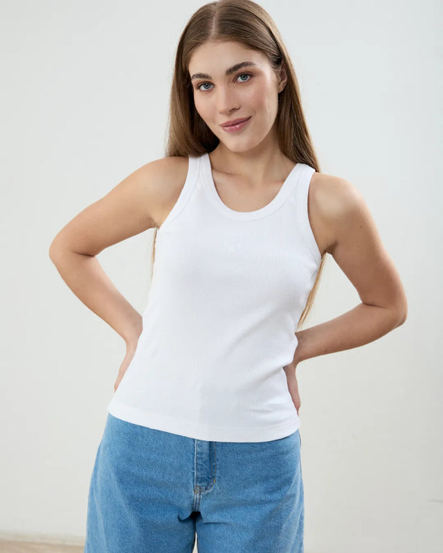 White Tank Top Fitted white organic cotton tank top with crew neck and decorative floral embroidery. Made from breathable ribbed fabric (95% organic cotton, 5% recycled elastane) that feels soft against the skin—perfect for summer layering or wearing alone with jeans. Ethically produced in Miguel's workshop in Porto. Machine wash at max 30°C, lay flat to dry, iron on low heat, and avoid bleach.