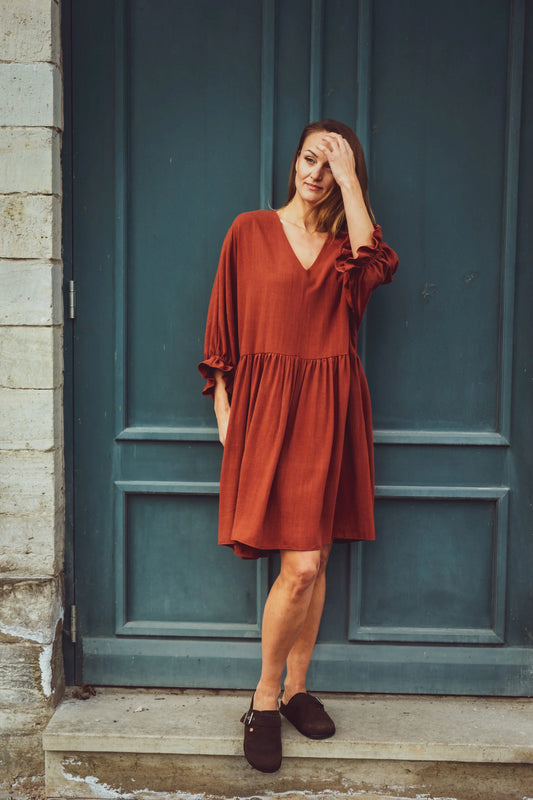 A summery and lightweight dress that can be worn two ways: with the deep V-neck on the front or back. Tessa has a nice oversized cut which makes it a super comfortable summer dress. The linen and viscose blend fabric feels lovely on hot days.