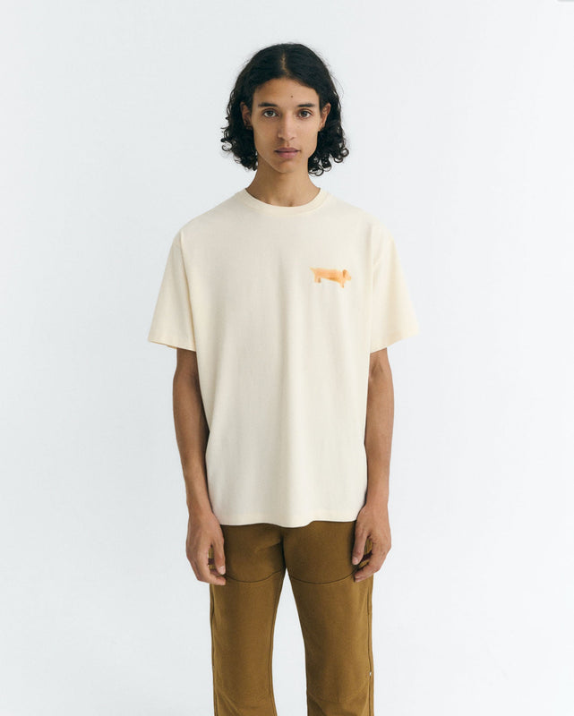 The Aaron T-Shirt Perro Salchicha White offers a relaxed fit crafted from 100% organic cotton with a medium-weight 180 gsm fabric, ensuring comfort and durability. Featuring a classic round neck and short sleeves, this regular-length tee displays a stylish printed dachshund design on the chest, combining casual wear with a distinctive touch. Ideal for those seeking sustainable, everyday apparel with character.