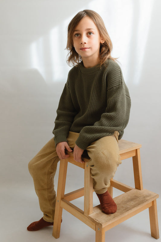 Golaf is a chunky and cozy knit sweater for the little ones. It has a relaxed fit and depending on the size you choose, it will fit more or less loose.