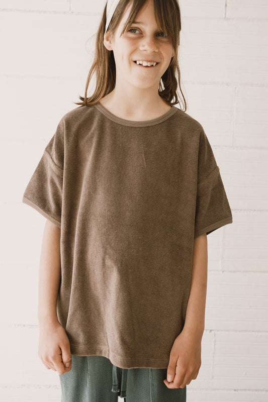 Kids oversized T-shirt in brown. Made with soft organic cotton terry fabric. This T-shirt is designed for ultimate comfort and a relaxed fit.