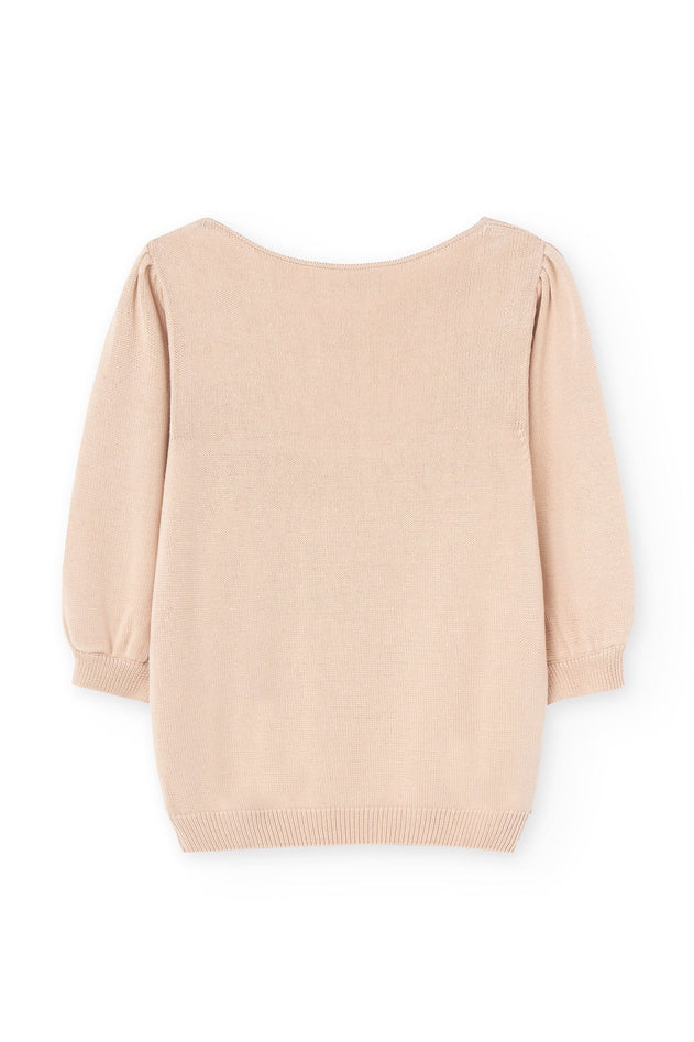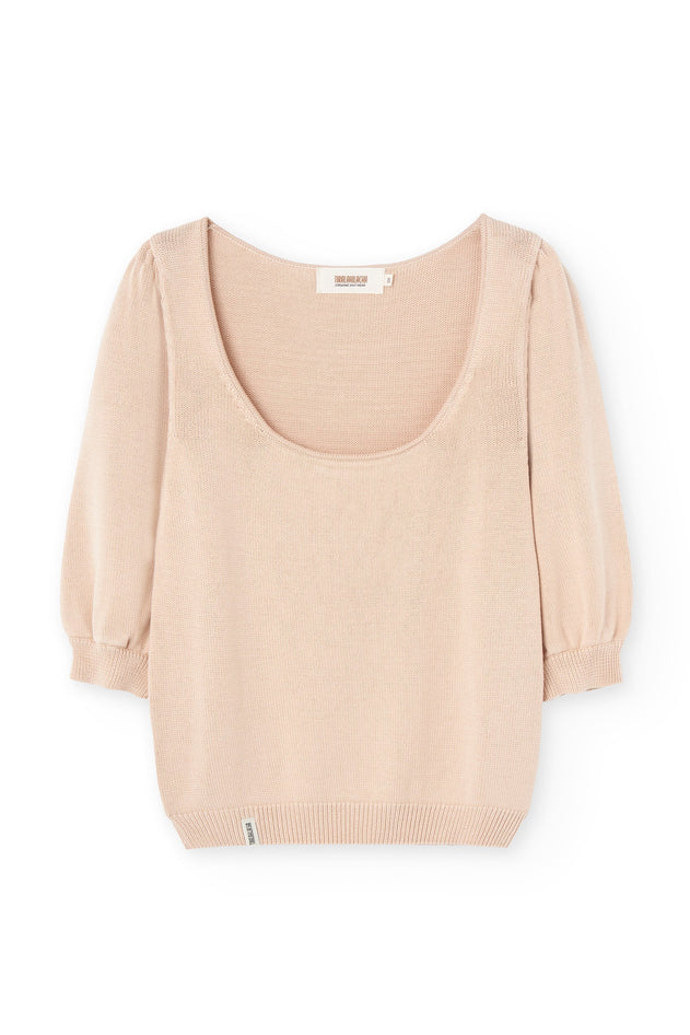 This knitted top has a beautiful wide neckline, 3/4 puffed sleeves, and is made of Tencel lyocell.