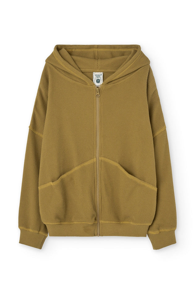 Kids' hoodie with a loose fit and dropped sleeves. Waffle fabric in a lovely mustard color. Comfortable and perfect for every day of the year.