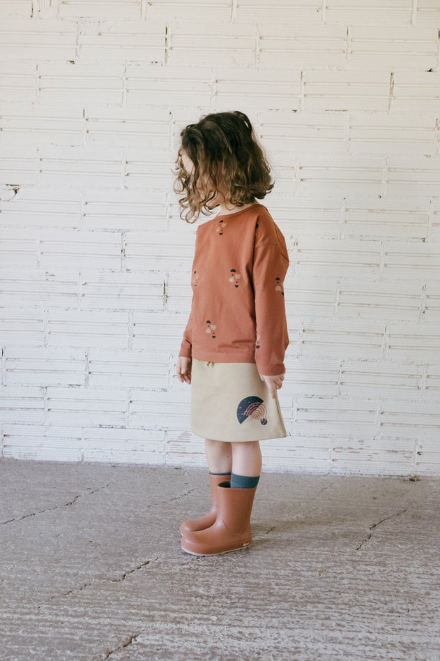 Beige kid's Gaya skirt with Tiralahilacha's sidereal rain print. Made from GOTS organic cotton.