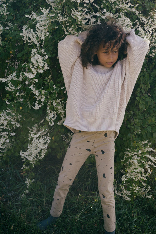 Galatea are very comfortable leggings made of organic cotton fabric. They have an elastic waistband for a better fit to your little one's size. Tiralahilacha's sidereal rain print in beige.