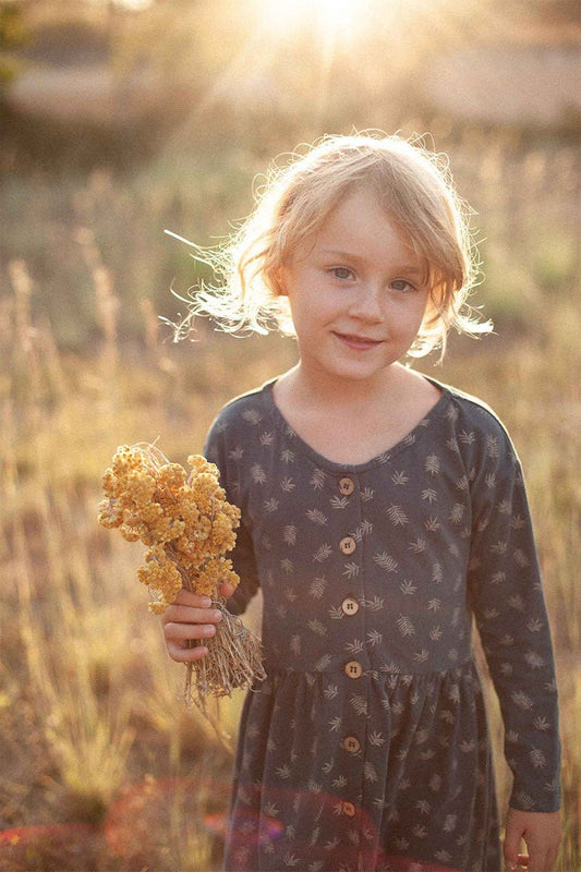 Kid's Sabrina long sleeve dress with dropped shoulders and a slit completely covered by buttons. Blue color with fern leaves print.