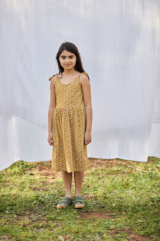 Kid's Strappy dress with adjustable ties and gathered waist. Tiralahilacha's ethnic print in mustard.