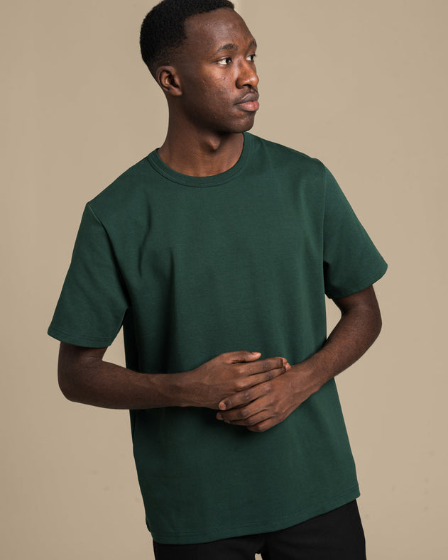 This timeless t-shirt is crafted from thick, high-quality interlock knit, ensuring durability and comfort. Its unisex fit offers versatile styling options, while the elegant dark green shade adds a refined touch to any wardrobe. For a shorter cut, consider exploring the Arki t-shirt.
