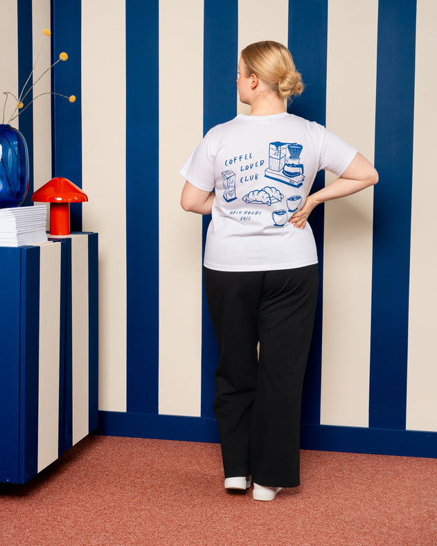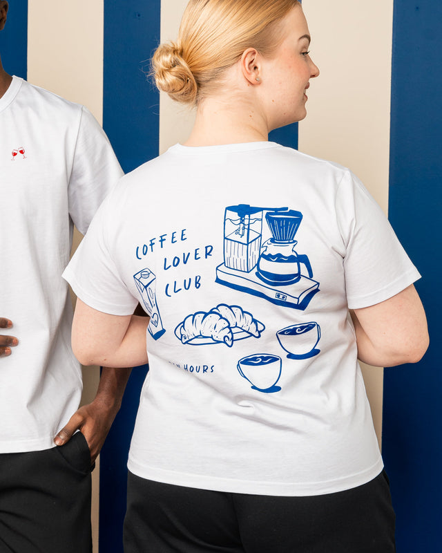 White T-shirt with a bold blue hand-drawn breakfast scene printed on the back. The T-shirt has a slightly wider neckline than normal, which gives the shirt a finished look.