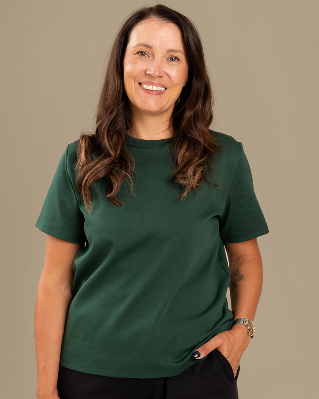 This classic and durable t-shirt is perfect for everyday wear. Crafted from thick, high-quality knit fabric, it feels luxuriously soft against the skin. Featuring a stylish dark green shade, the Arki T-Shirt offers a shorter, more fitted silhouette compared to the timeless Ajaton tee, combining comfort with a modern, tailored look.