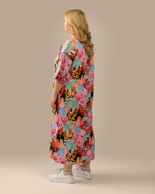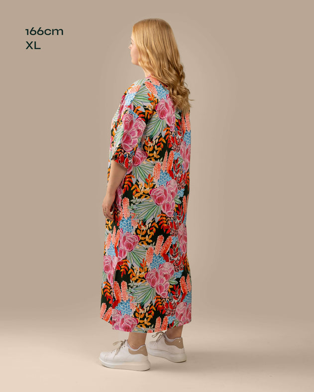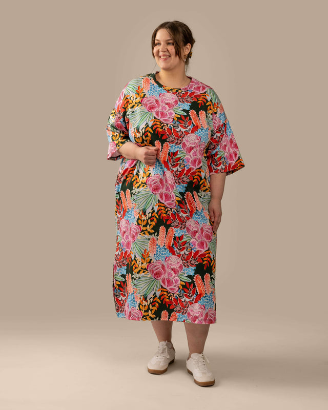 Boxy midi dress in Toive's colorful and cheerful floral pattern Kedolla. The oversized dress has dropped shoulders and slits on the sides, and the thick jersey material stretches pleasantly.