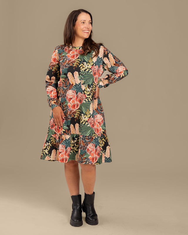 The Lempi Dress Kedolla features a lightweight A-line silhouette with a gathered hem for an effortlessly elegant shape. Its round neckline and long sleeves create a relaxed yet refined look, while the stylish earthy Kedolla pattern adds versatile charm suitable for various occasions. This dress combines comfort with understated sophistication for a polished everyday wardrobe essential.
