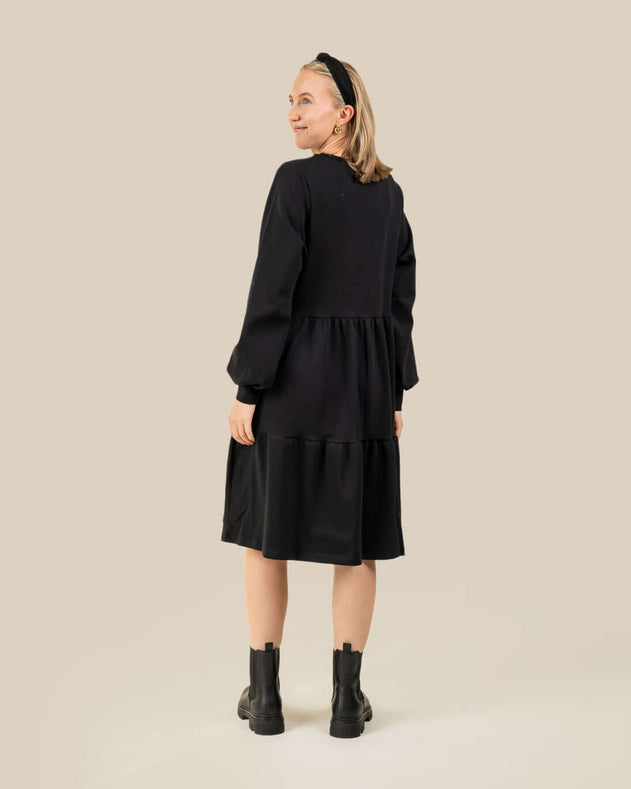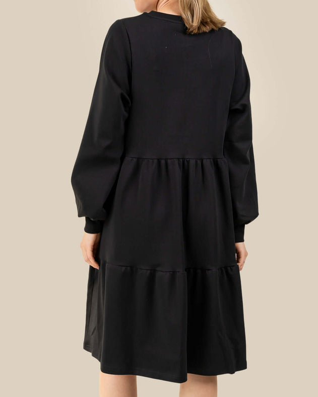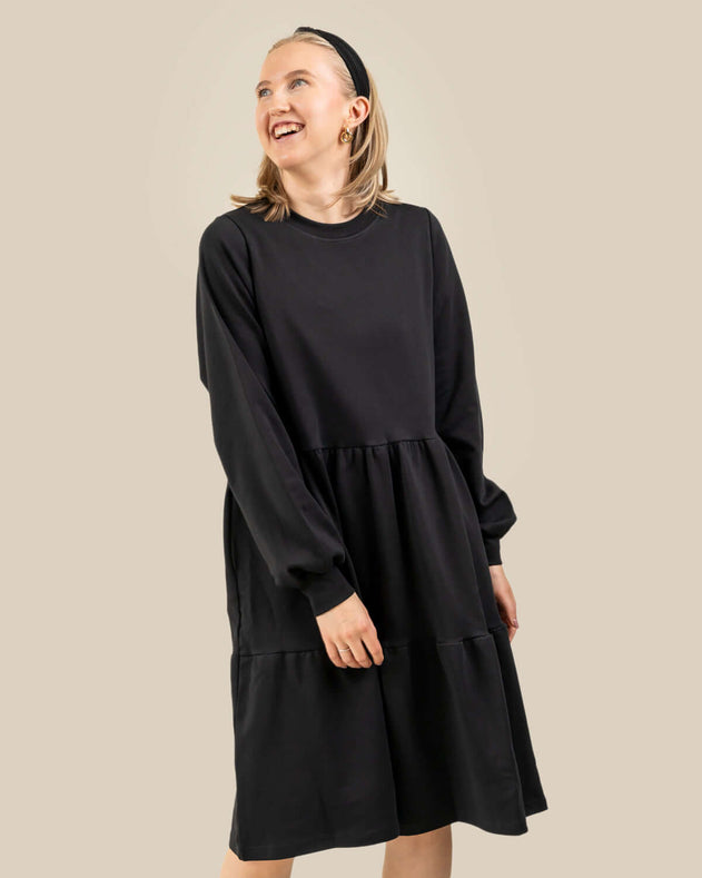 This Toive's long-sleeved black dress is elegantly designed with a rounded neckline and the desired pockets. The dress is made from a high-quality interlock knit fabric, ensuring both comfort and luxury.