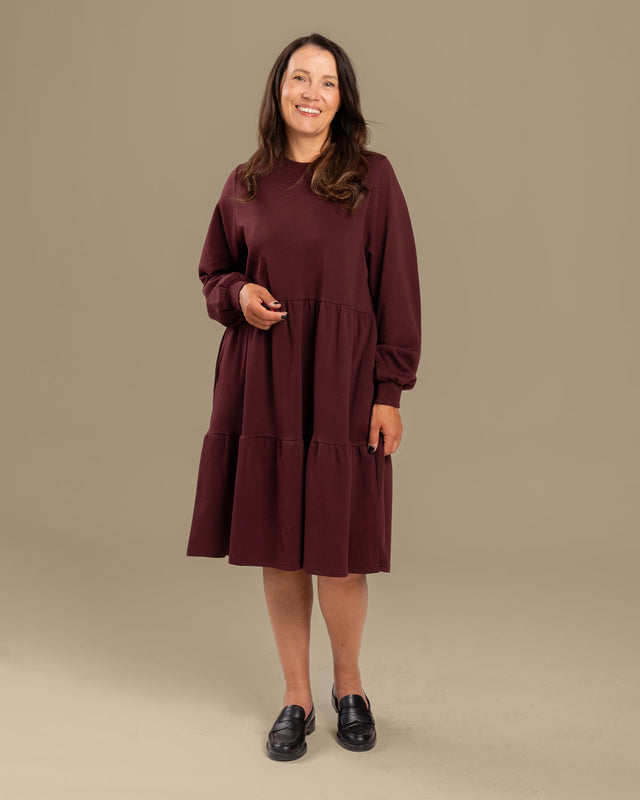 This long-sleeved dress in a rich burgundy shade features a classic round neckline and practical pockets for added convenience. Crafted from soft interlock knit fabric made of 100% cotton, it offers both comfort and breathability, making it ideal for everyday wear with a refined touch.