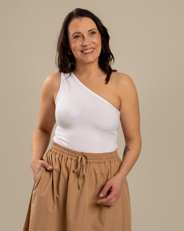 A stylish one-shoulder fitted top crafted from a soft lyocell-elastane blend. The knit offers a beautifully snug fit that stays comfortably in place. Perfect for special occasions and festive moments.