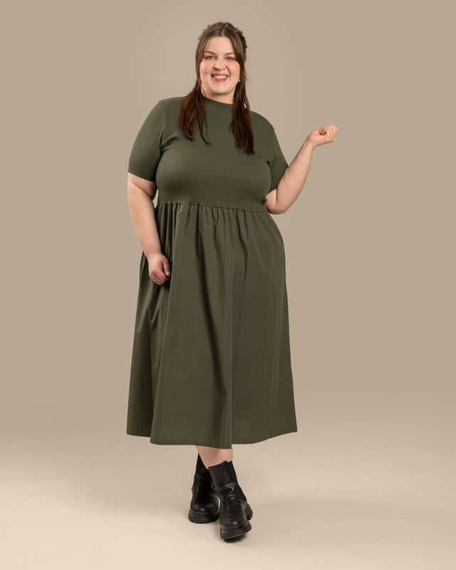 A flattering dress combining t-shirt sleeves with a stylish turtleneck. The fitted top is crafted from stretchy rib knit, while the flared skirt is made of smooth cotton fabric. Finished with practical side pockets, it’s the perfect blend of comfort and elegance.