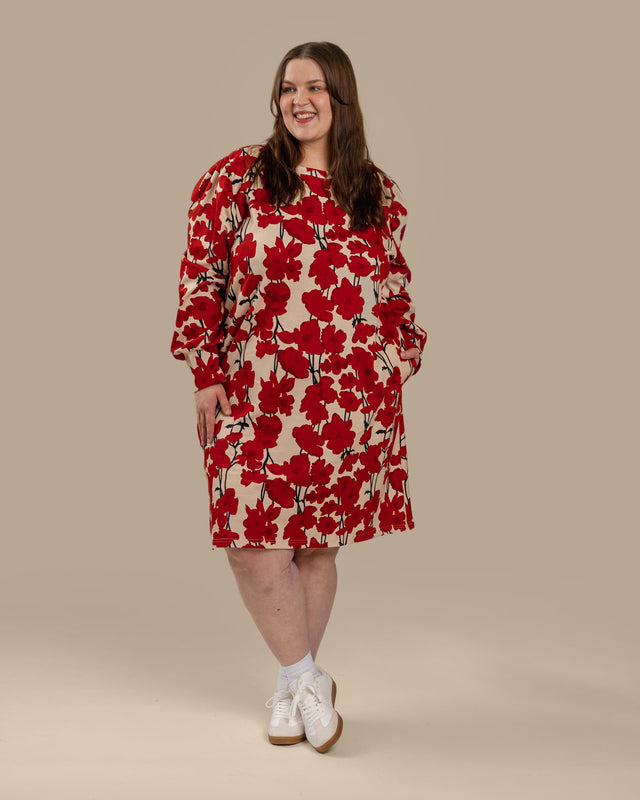 A charming long-sleeved dress with elegant pleated sleeves and a classic fit. It features a straight hem and practical side seam pockets. Adorned with the beautiful Valmut pattern, it’s both stylish and functional.