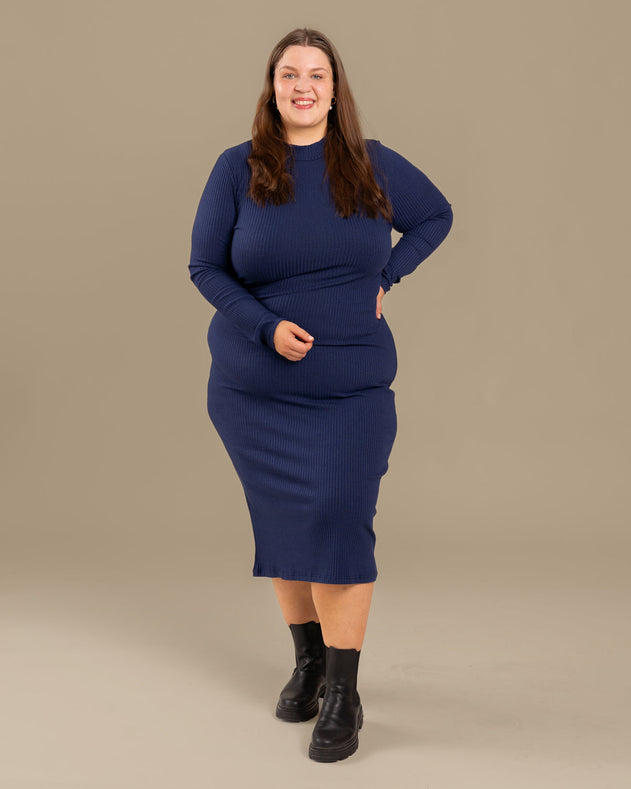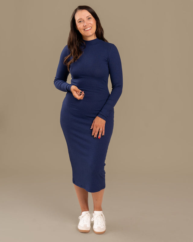 This form-fitting ribbed dress is crafted from flexible knit fabric, ensuring comfort and a flattering silhouette. Featuring a sophisticated turtleneck collar and long sleeves, it offers a polished look suitable for various occasions. The elegant deep navy shade adds timeless style. For someone standing 170 cm tall, the dress falls just below the knee.