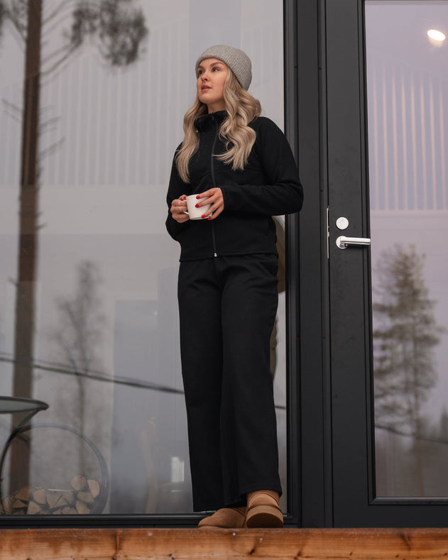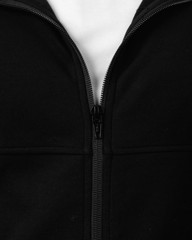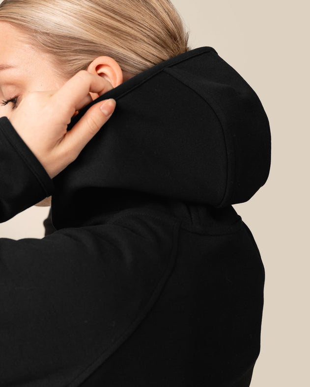 Introducing the Zip-Up Hoodie — the embodiment of classic and comfort by Toive. This black hoodie is equipped with a full-length zipper for added convenience. Its traditional hoodie design comes with a hood and pockets, complimented by the shift-forward side seams. The side seams not only serve as an interesting design detail but also boast additional pockets.