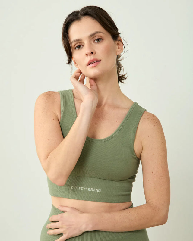 Green organic cotton sports top with wide straps and removable padding. Seamless, reinforced fabric prevents transparency while allowing full freedom of movement. Breathable and lightweight for low to medium impact activities. Made from 85% organic cotton, 8% polyamide, and 7% elastane in Portugal.