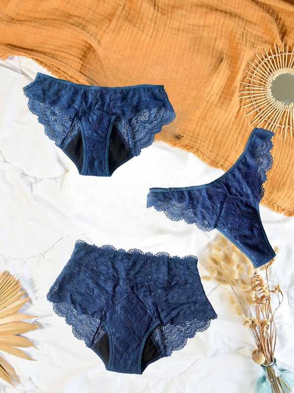 Treat yourself to the menstrual trio with our new panties, the high-waisted menstrual panties and the blue lace menstrual thong , the ideal combo for three days of light to medium flow.