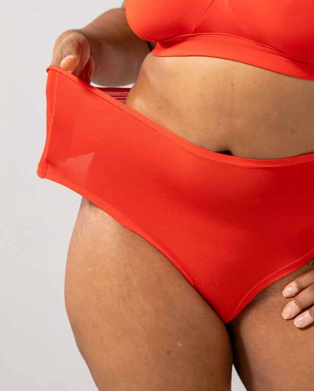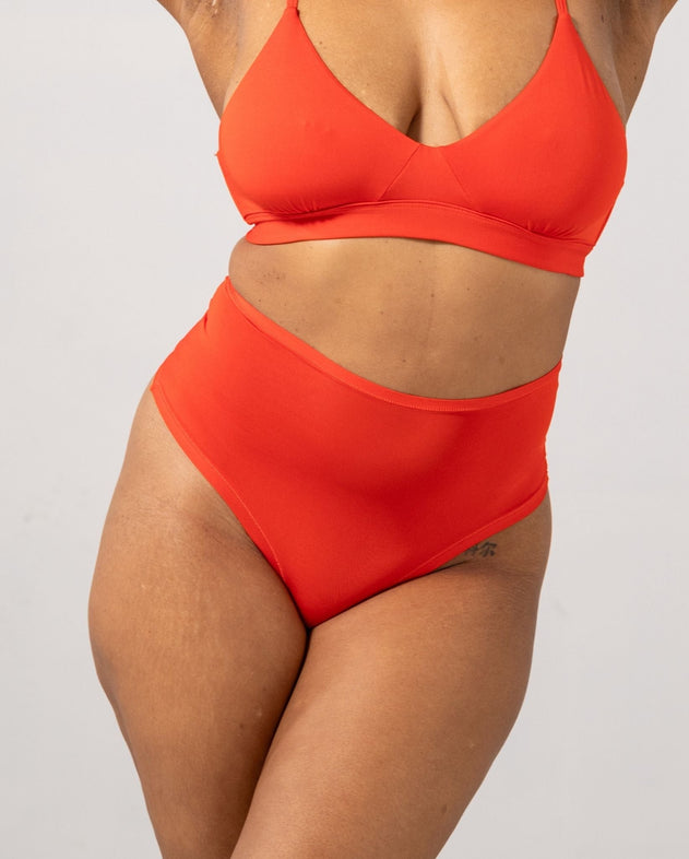 The fabric is made from recycled microfiber, giving it a smooth texture and a pleasant, subtle finish resembling a peach skin. The ultra-stretchy material ensures maximum comfort and flexibility, while the high waist design and minimal bum coverage provide a barely-there sensation. Noteworthy features also include reversed flatlock seams, enhancing the smooth silhouette and stretch, and a soft silicone care label, eliminating the discomfort of itchy tags.