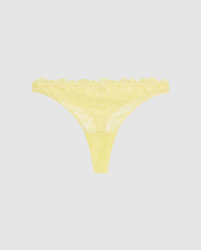 Mid-rise string that can be worn high in the waist or lower on the hips. Made in full lace with scalloped edges at the top. Thin elastics at the waist and along the leg openings.