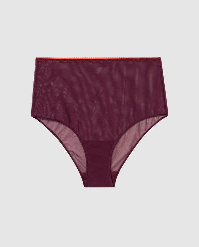 High-waisted briefs made of sheer mesh. High-rise fit that hits just below the belly button. Full bum coverage for a flattering fit. Thin elastics inside the waistband and leg openings